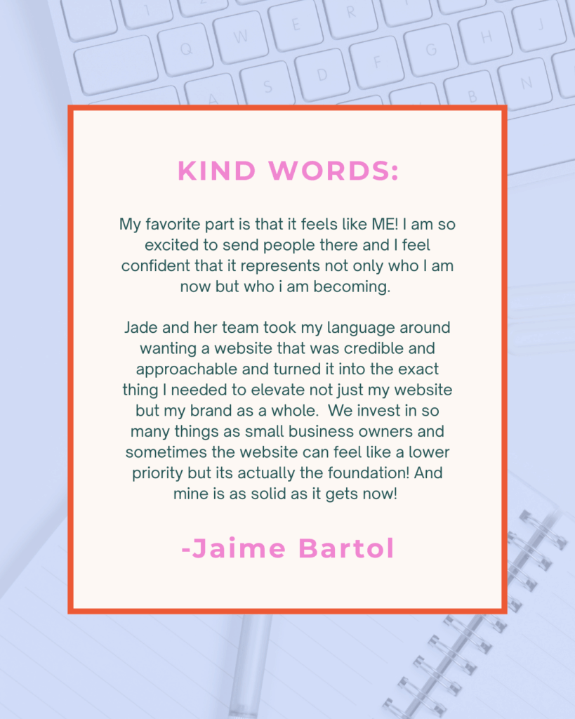 Once the visual direction was locked in, our team moved into the full website design that emphasized clarity, bold color, and strong calls to action. Jaime wanted a site that inspired visitors to take the next step and feel supported from the moment they landed. You can check out the Jaime Bartol Coaching website here to see the final result. Every page was created to guide high achieving women toward booking, engaging, and learning more about her coaching services.